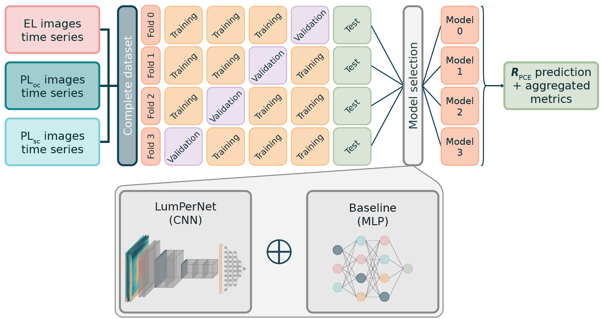 Perovskite solar cells (PSCs) have rapidly gained in power conversion efficiency (PCE) within the last 15 years, providing a promising alternative or add-on to established silicon semiconductors for future’s large-scale photovoltaic (PV) deployment. Yet, besides scalability of fabrication routines, operational stability remains a key bottleneck for commercial roll-out of perovskite based PV. In this context, reliable and fast assessment of the state of health and degradation mechanisms that is compatible with field deployment are of utmost importance. Electrical diagnostics such as current–voltage (J–V) sweeps under illumination provide accurate performance metrics but are time-consuming and do not resolve spatially localized degradation, motivating non-invasive imaging-based alternatives. Here, we present a deep-learning framework to estimate PSC efficiency retention $R_\mathrm{PCE}$ = $\mathrm{PCE_t / PCE_0}$ directly from multimodal luminescence imaging acquired during device aging, and we demonstrate that leveraging spatially resolved luminescence patterns may reveal key to improving prediction performance and robustness compared to intensity-only baselines. In our approach, each learning sample consists of electroluminescence (EL), open-circuit photoluminescence (PLoc), and short-circuit photoluminescence (PLsc) acquired at an aged state together with devicespecific reference images at t = 0, enabling the model to learn degradation-relevant spatial changes relative to the initial condition. These data were acquired over a time span of 5–70 h in an automated, house-built measurement platform. We introduce LumPerNet, a compact convolutional neural network that regresses $R_\mathrm{PCE}$ from stacked multimodal image tensors, and benchmark it against an intensity-only baseline multilayer perceptron regressor. Using a leakageaware evaluation protocol with device-level held-out testing and four-fold cross-validation, and restricting analysis to the operational window $R_\mathrm{PCE} \in [0.8, 1.2]$, LumPerNet achieves a substantially higher and more robust performance ($\mathrm{MAE}: −23.4 \%, \mathrm{RMSE}: −25.6 \%, R^2: +0.417$) with respect to the intensity-only baseline, confirming that spatially resolved EL/PL patterns carry predictive information beyond global luminescence decay. To quantify the role of multimodality, we further perform an exhaustive modality ablation study over all single- and paired-modality inputs. We find that multimodal training yields the best generalization, while carefully chosen bimodal configurations can retain most of the full-model performance, whereas other pairings can be unstable across device splits, highlighting that complementary physical contrast, rather than channel count, governs robustness. Representative device trajectories further show temporally coherent $R_\mathrm{PCE}$ estimates and uncertainty quantification via model ensembling. Overall, this work establishes a reproducible pipeline linking automated luminescence imaging to electrical $R_\mathrm{PCE}$ labels, and positions spatially resolved imaging as a practical route for accelerated stability testing and non-invasive degradation monitoring in perovskite photovoltaics.